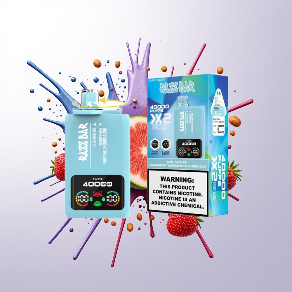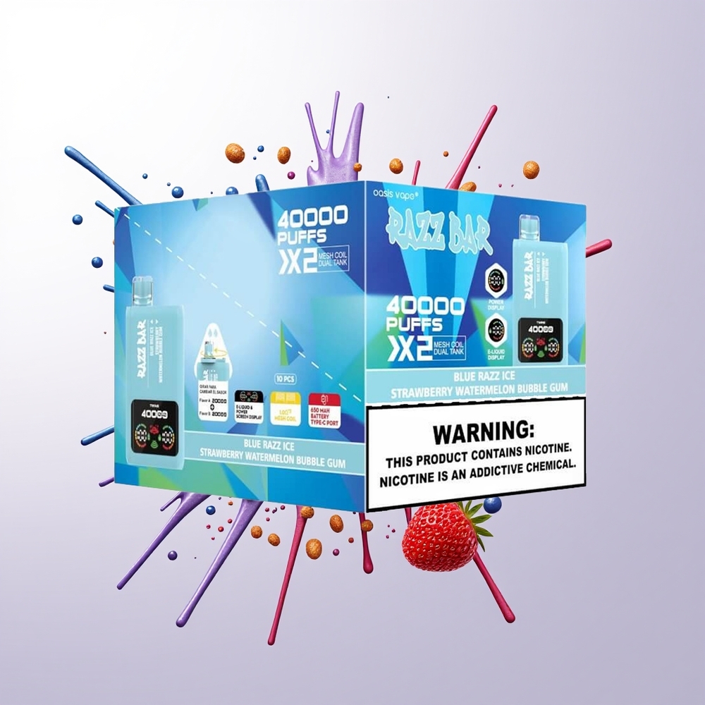 Razz Bar 40000 Puffs Blue Razz Ice Strawberry Watermelon Bubble Gum Power Screen Display 1.0Ohm 2 Mesh Coil 650mAh Type-C Port 2%5% Nicotine